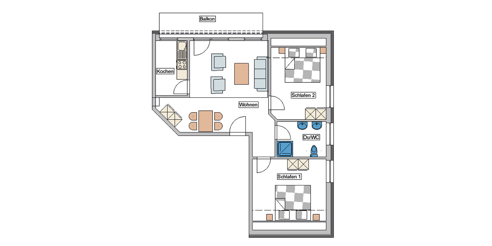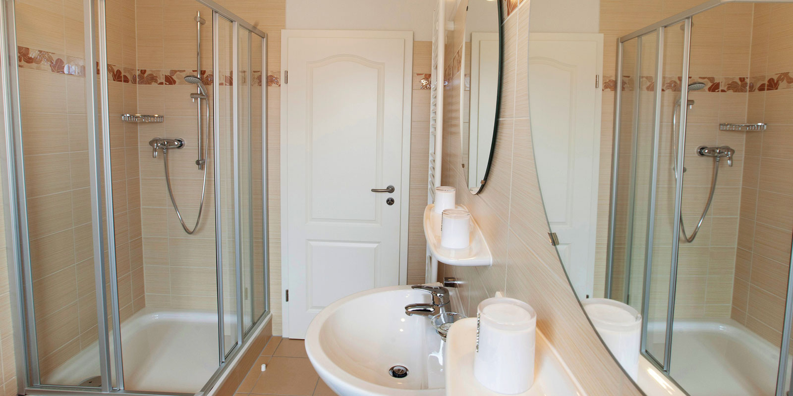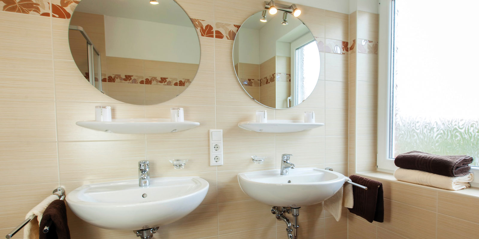 Fenster, Dusche, WC, 2 Waschbecken, Fön